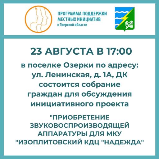 Инициативная группа, созданная для реализации инициативного проекта «Приобретение звуковоспроизводящей аппаратуры для МКУ «Изоплитовский КДЦ «Надежда» приглашает вас на собрание граждан, которое состоится 23 августа 2024 года в 17:00.