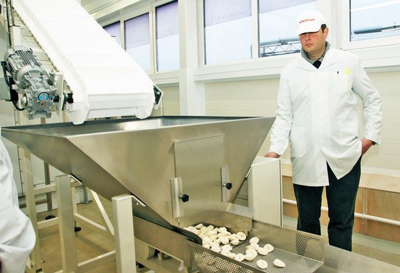 Пельмени делаются так: на линию подается свиной фарш с добавлением специй в соответствии с разработанной рецептурой. Далее начинка и тесто поступают в формовочную машину. Затем продукция попадает на конвейерную линию для ручной лепки, потом отправляется в скороморозильный агрегат (фризер). Внутри фризера используется технология шоковой заморозки. Температура воздуха в камере доходит до 30 градусов мороза! Замороженные пельмени и вареники оказываются на линии фасовки, где упаковываются в пакеты по 450 и 900 грамм. Производительность линии - 2500 кг готовой продукции за 12-часовую смену. Старый цех делал не более тонны пельменей и вареников за день, мощность нового пельменного цеха - до 5 тонн продукции в сутки. Таким образом, объемы производства полуфабрикатов выросли в пять раз.